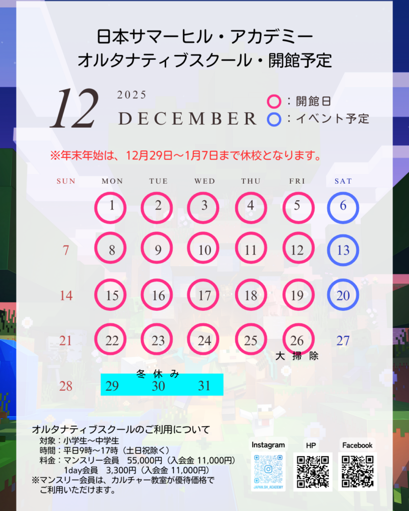 オルタナティブスクール12月の開館予定