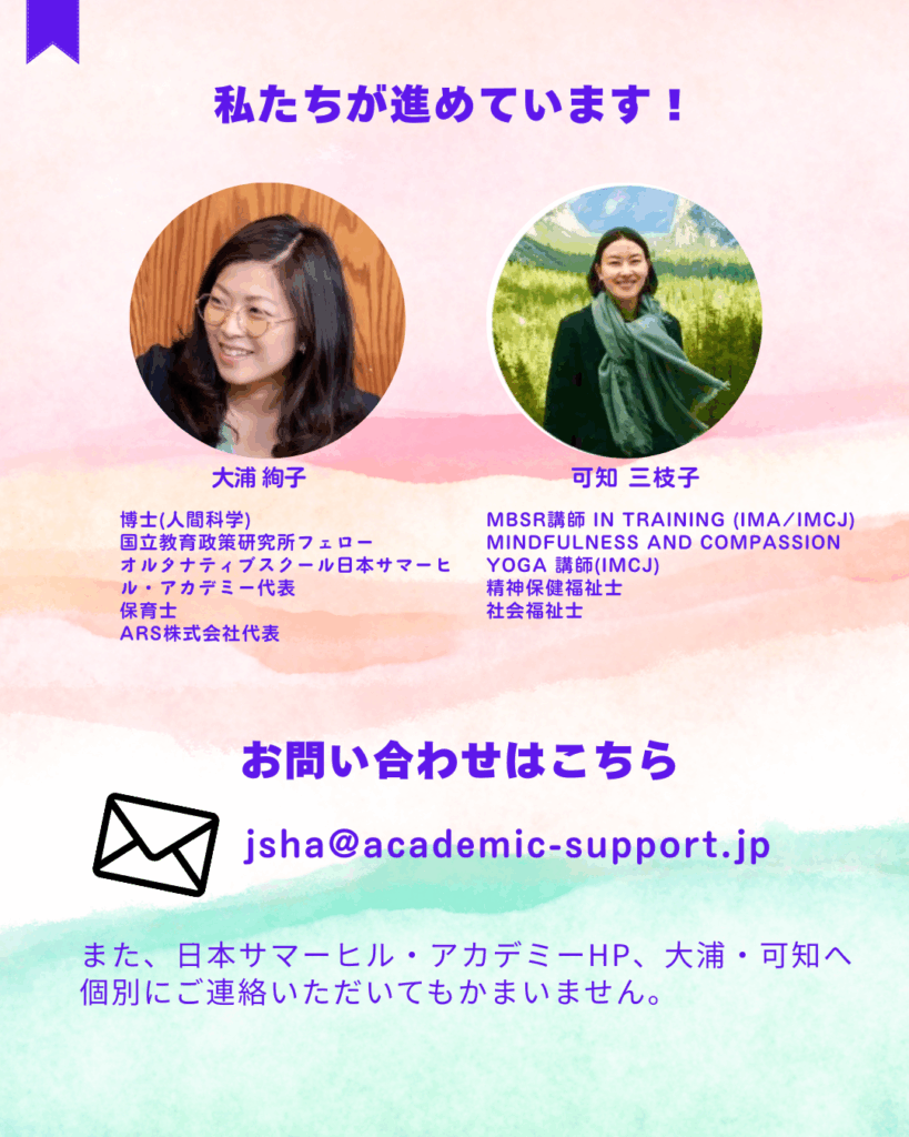 オルタナティブスクール日本サマーヒル・アカデミーをフィールドとした『子どもマインドフルネス教育プログラム』の開発と効果検証を行うこととなりました。詳細はこちらをご覧ください。