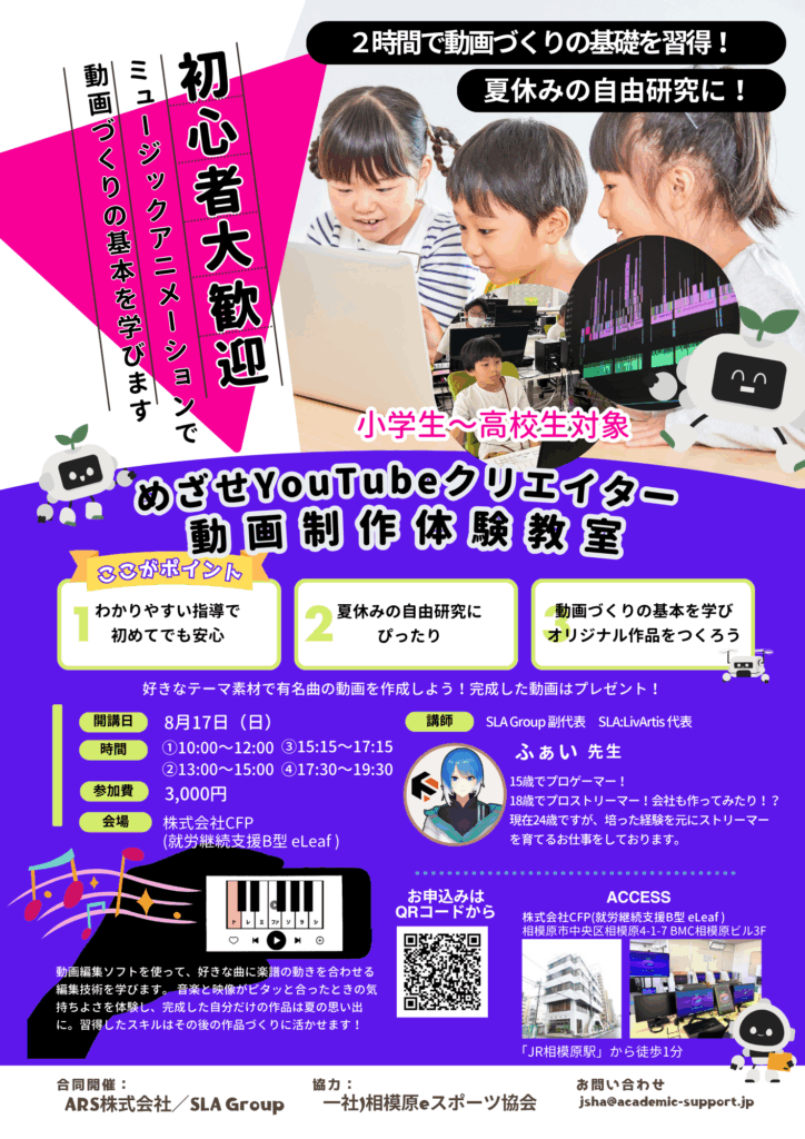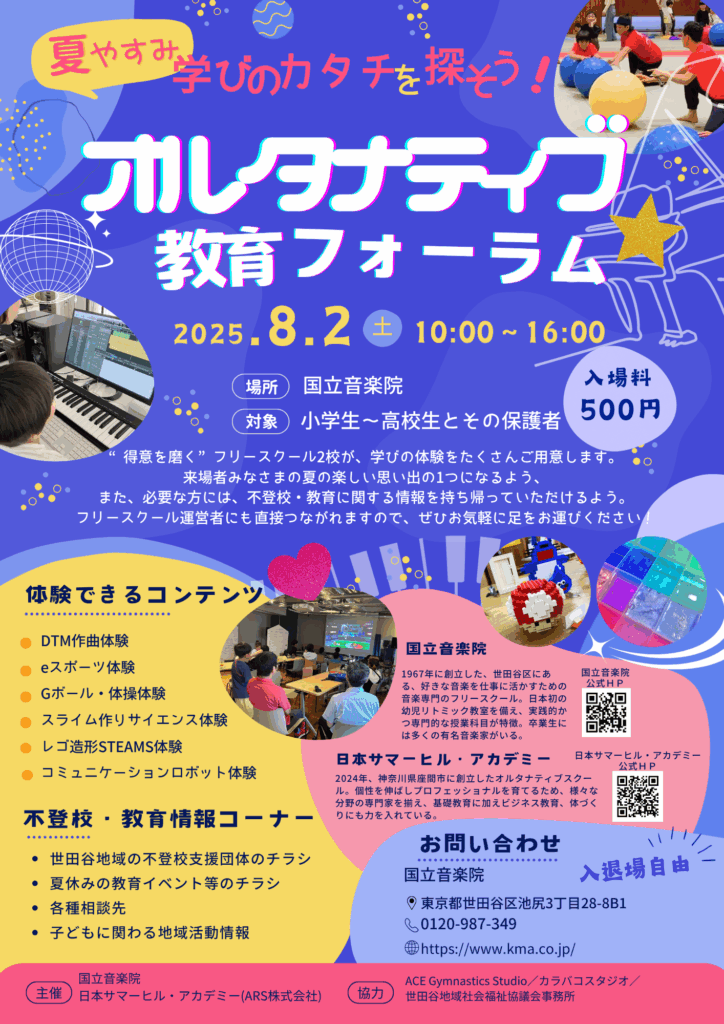 こどもが得意を発揮し教える側に挑戦する「こどもカレッジ」を開催。スライム・レゴ・eスポーツ解説など小中学生が企画し、自立と自信を育む時間となりました。ご来場・ご協力ありがとうございました。