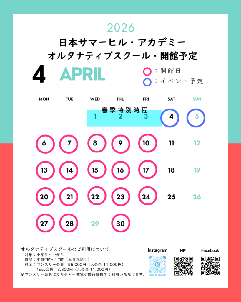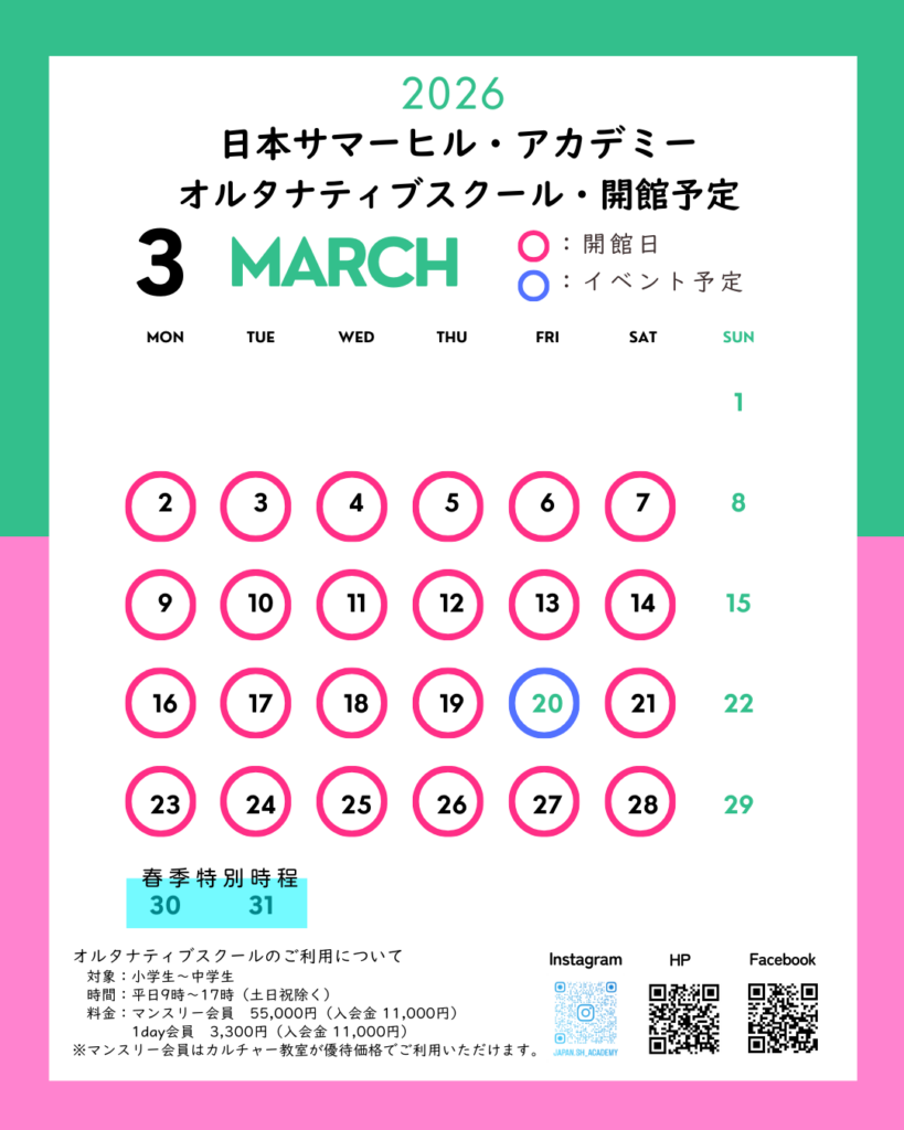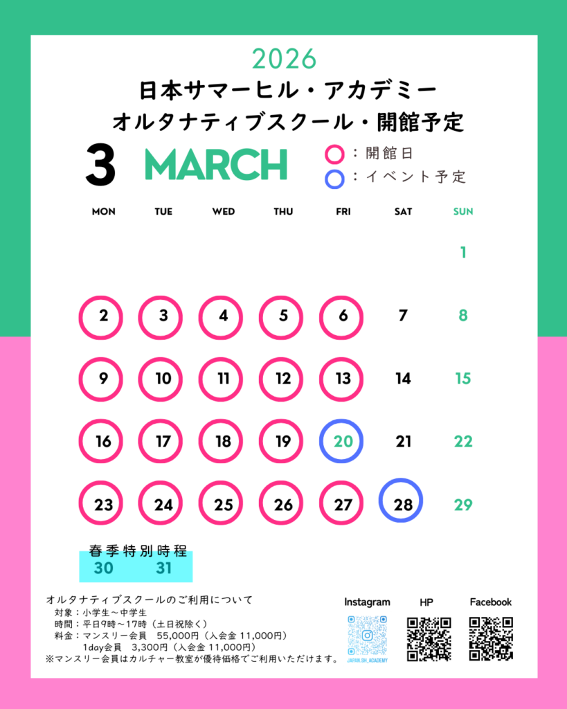 日本サマーヒル・アカデミーオルタナティブスクール3月の開館予定です。
