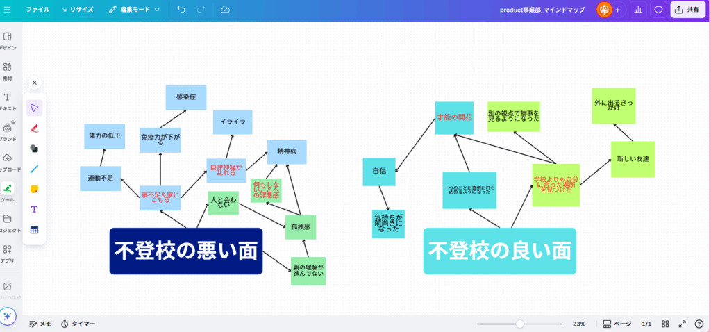 初日のお顔合わせとオンライン会議を終え、続いては、紙に書き出したマインドマップを皆で共同編集できるように電子化する作業を進めました。中1くんよくがんばった。