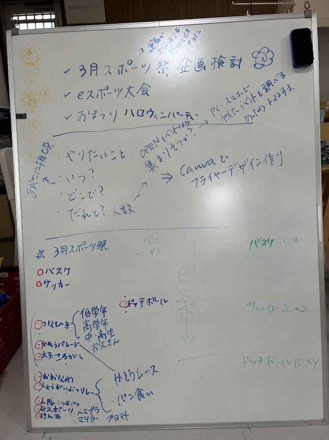 日本サマーヒル・アカデミーの生徒だからこそ“あり”の、eスポーツを種目に入れようねと。これもとても新しいのではないかな。会場はオフラインなので、どのゲームならできるかを書き出しました。