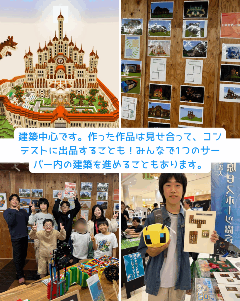 実績を残すことを目標に、一般公募のコンテストに出品することもあります。みんなで1つのサーバー内の建築を進める際は、役割をそれぞれ分担して協力する姿が見られます。