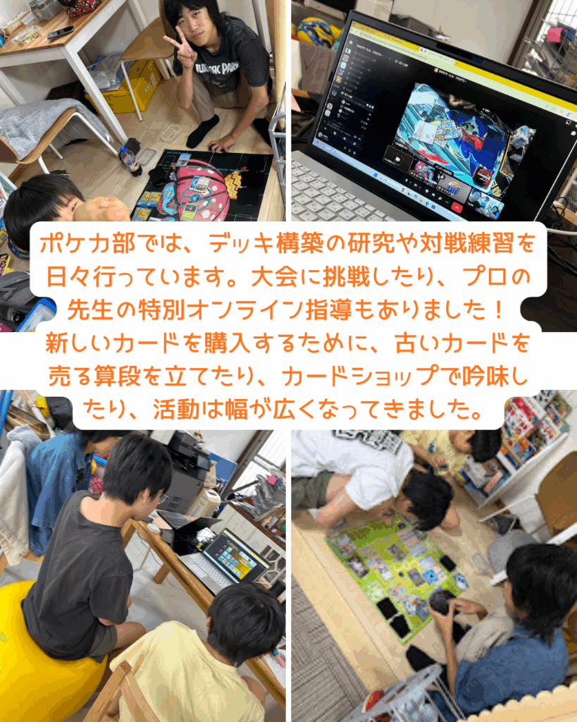 ポケカ部では、デッキ構築の研究や対戦練習を日々行っています。大会に挑戦したり、プロの先生の特別オンライン指導もありました!