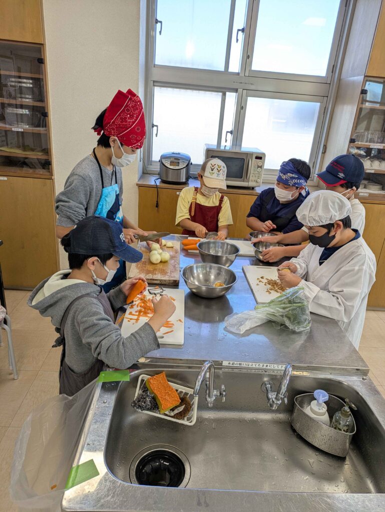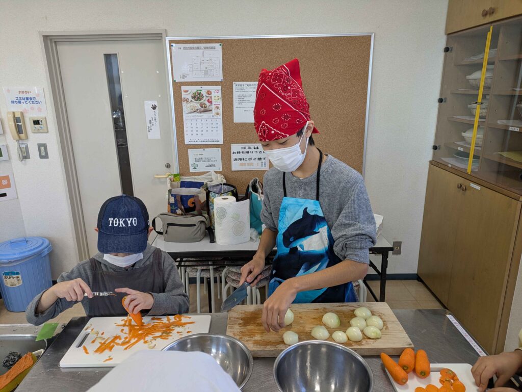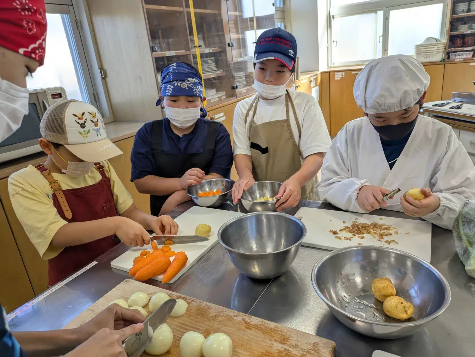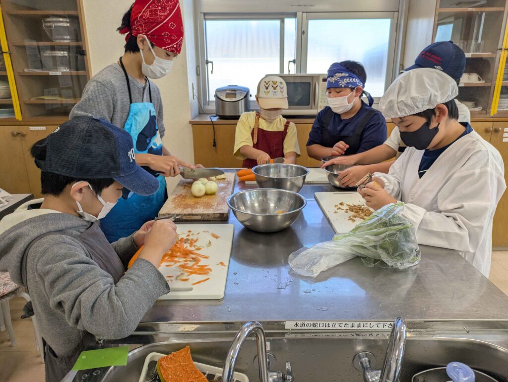 カレー&シチューは材料、作る工程はほぼいっしょ。野菜を洗って皮を向いて包丁で切って、お肉は初めて触った子もいましたね。お米も研いで大きな炊飯器で炊きました。