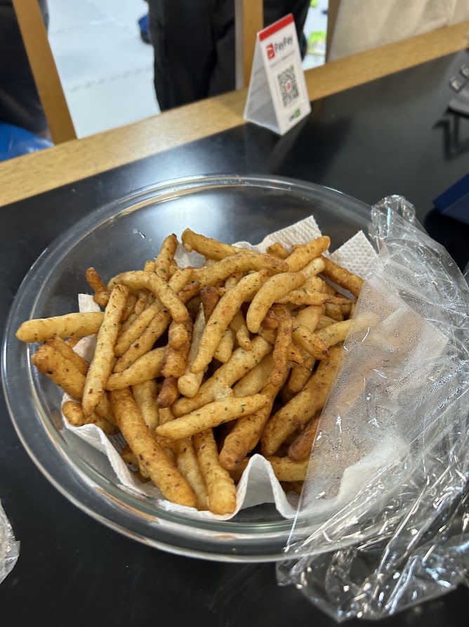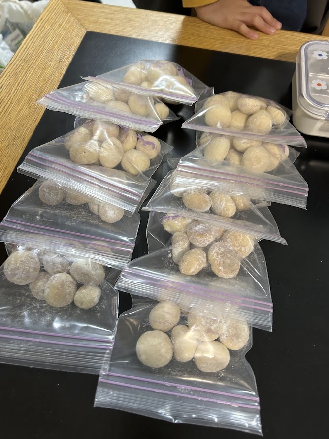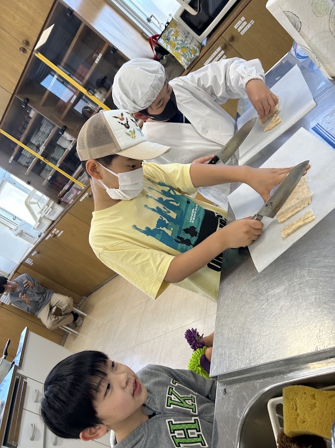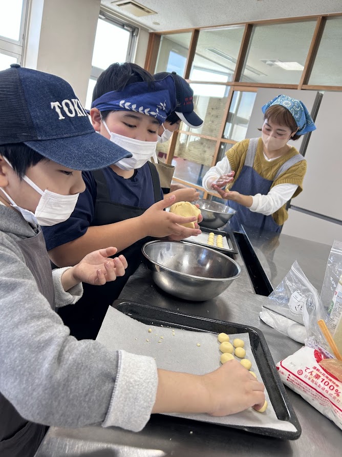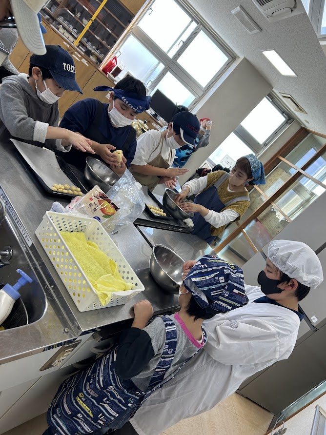 じゃがりこ・クッキーは引き続き調理が進んでおり。クッキーは材料をこねて、1つ1つ丁寧にまるめてオーブンで焼きました。じゃがりこは材料をこまかく切ってこねて細くカット、最後は揚げて、おいしく完成!