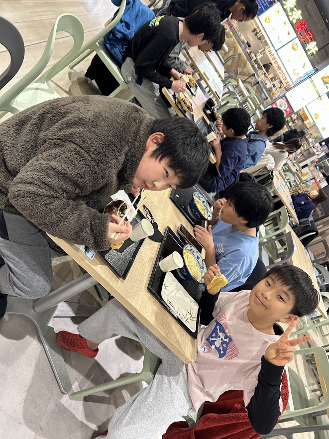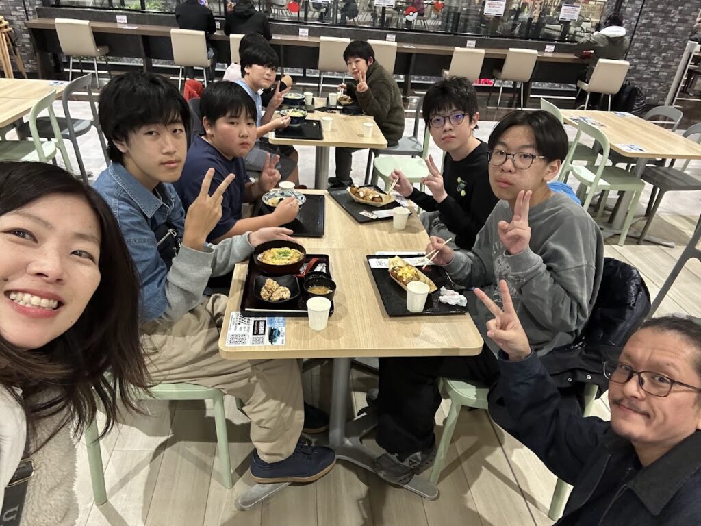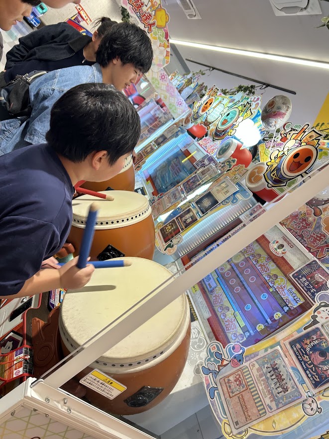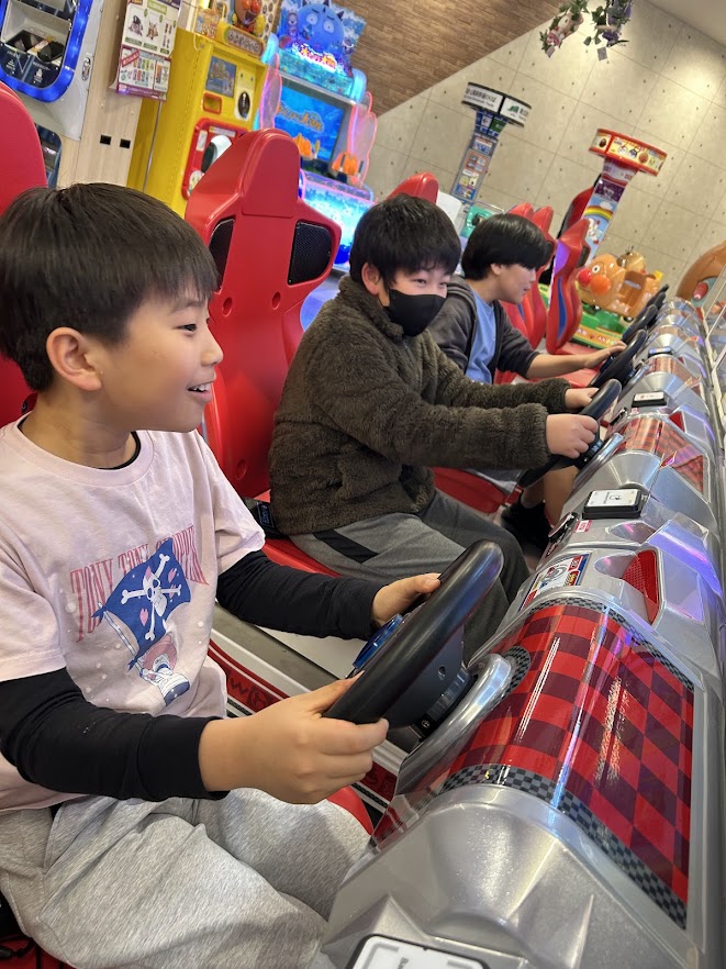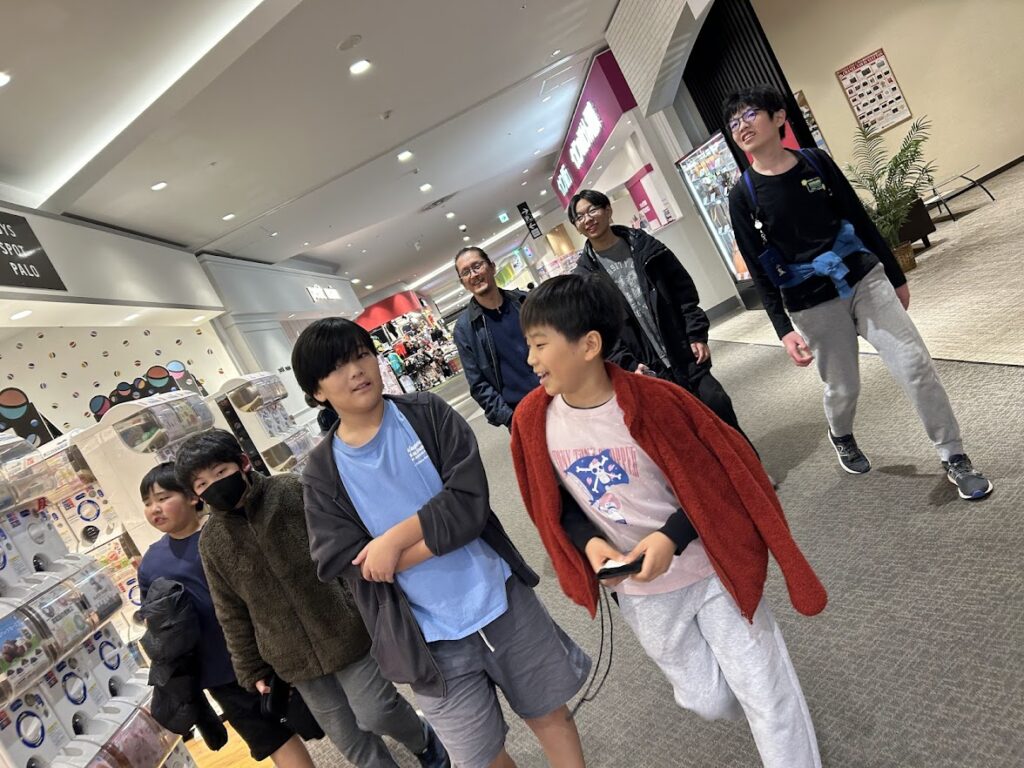 夜ごはんはそれぞれ好きなお店で注文し、席に集合しておしゃべりしながら楽しい時間を過ごしました。その後はゲーセンへ立ち寄り、太鼓、バスケ、マリオカートなど、残金を確認しながら思い思いに遊びました。