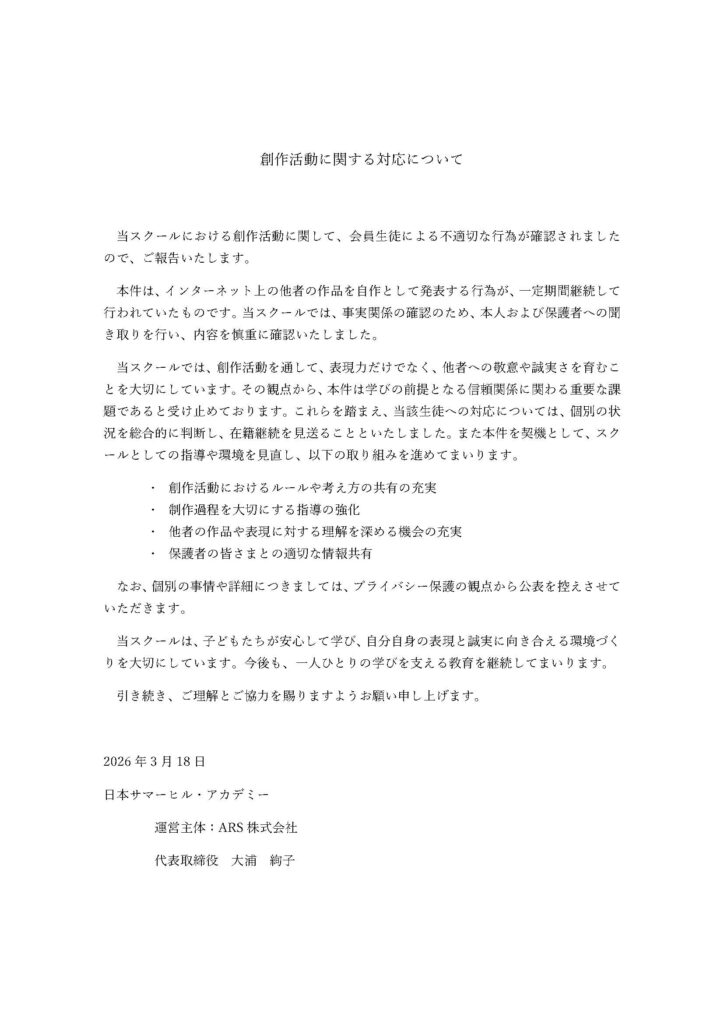 当スクールでは、創作活動を通して、表現力だけでなく、他者への敬意や誠実さを育むことを大切にしています。その観点から、本件は学びの前提となる信頼関係に関わる重要な課題であると受け止めております。これらを踏まえ、当該生徒への対応については、個別の状況を総合的に判断し、在籍継続を見送ることといたしました。また本件を契機として、スクールとしての指導や環境を見直し、以下の取り組みを進めてまいります。